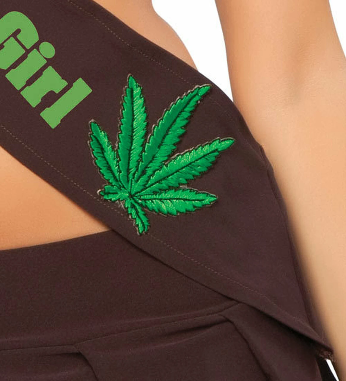 Make an ultra fresh and modern sexy fashion forward statement in this awesome Colorado Brownie Girl Costume. 4 piece cannabis themed Brownie costume includes pleated sexy pleated short skirt with cannabis green detail at hem, tie front crop top, bold brown sash with sewn on cannabis patches, and jaunty relaxed look white beret with happy face and marijuana leaf patch at cap front. Cannabis culture will salute your sexy pride!