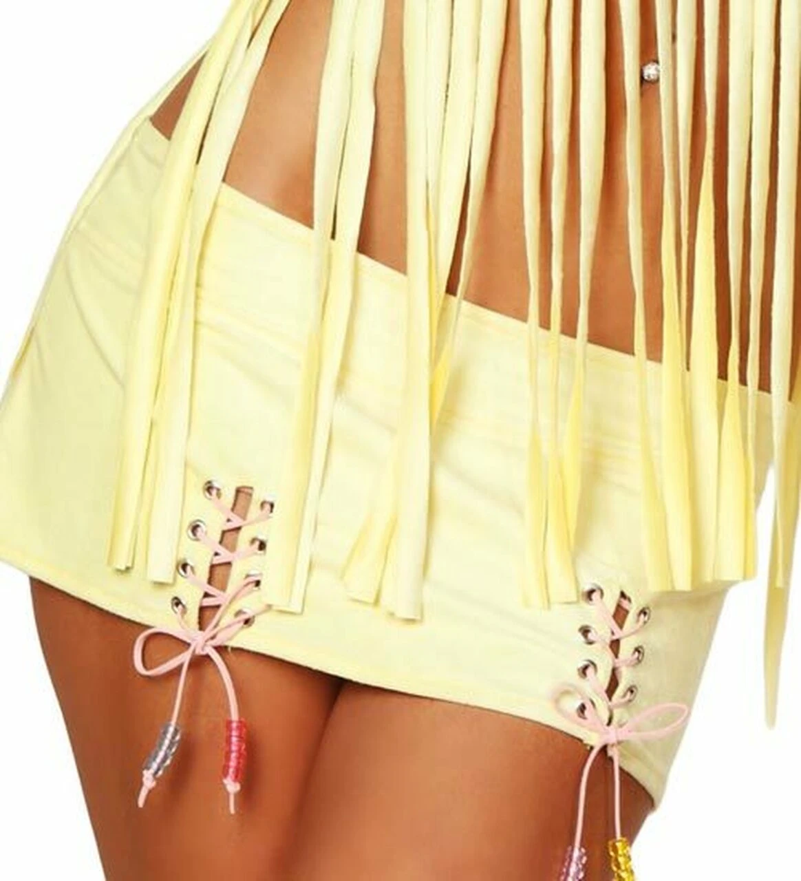This Sexy Flower Child Costume features a beautiful braided headband with flower, seamless pull-on mini skirt with attractive lace-up accents and tie back faux suede halter with an excellent fringe. The costume is also detailed with matching leg warmer consisting of side border trim and a unique faux mohair vest.