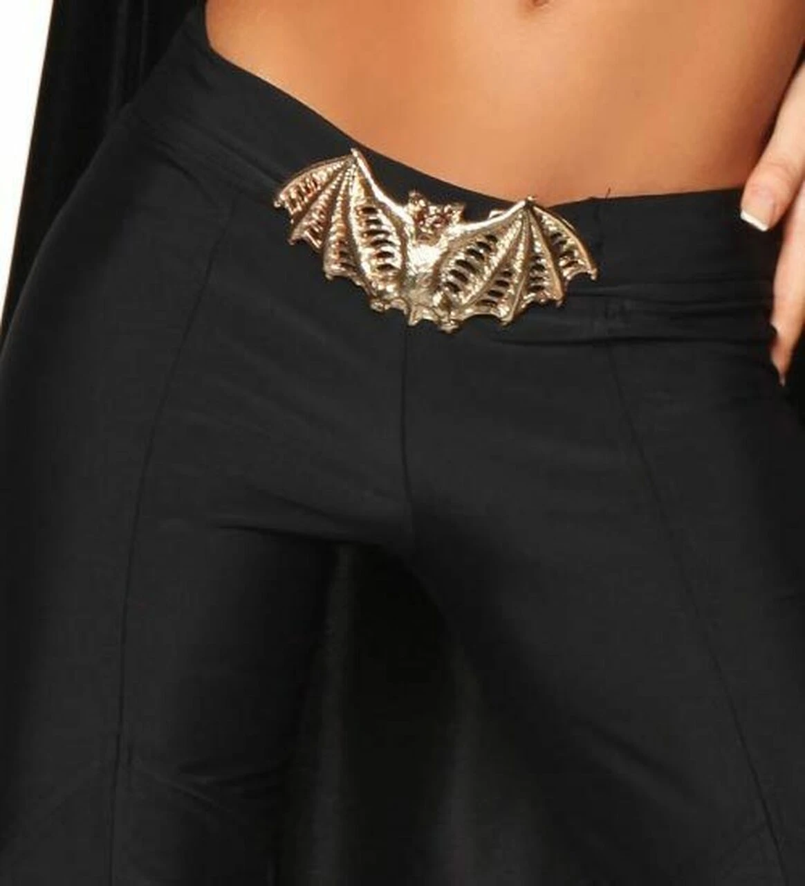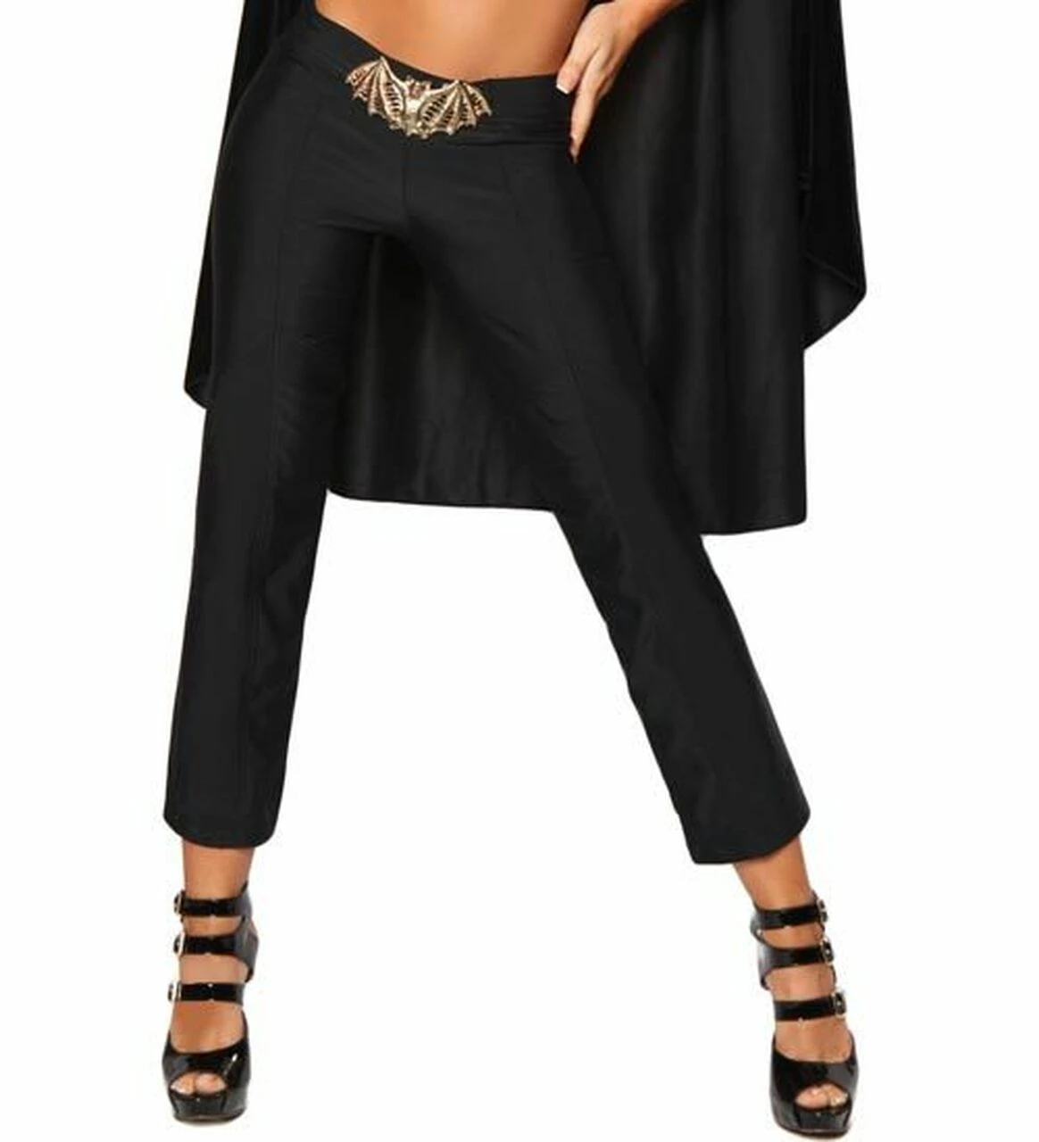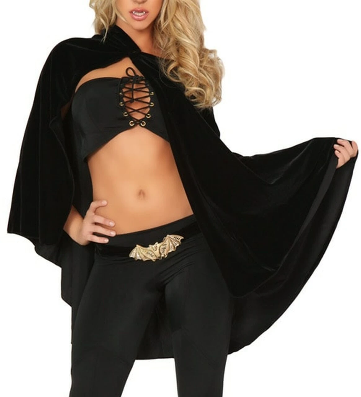 Vamp Attack Costume includes Microfiber Tube Top with Contrast Gold Eyelets and Lace-up Detail, Slinky Microfiber Cropped Pants with Attached Belt featuring Gold Metal Bat Buckle, and Sexy Stretch Velvet Off-the Shoulder Cape