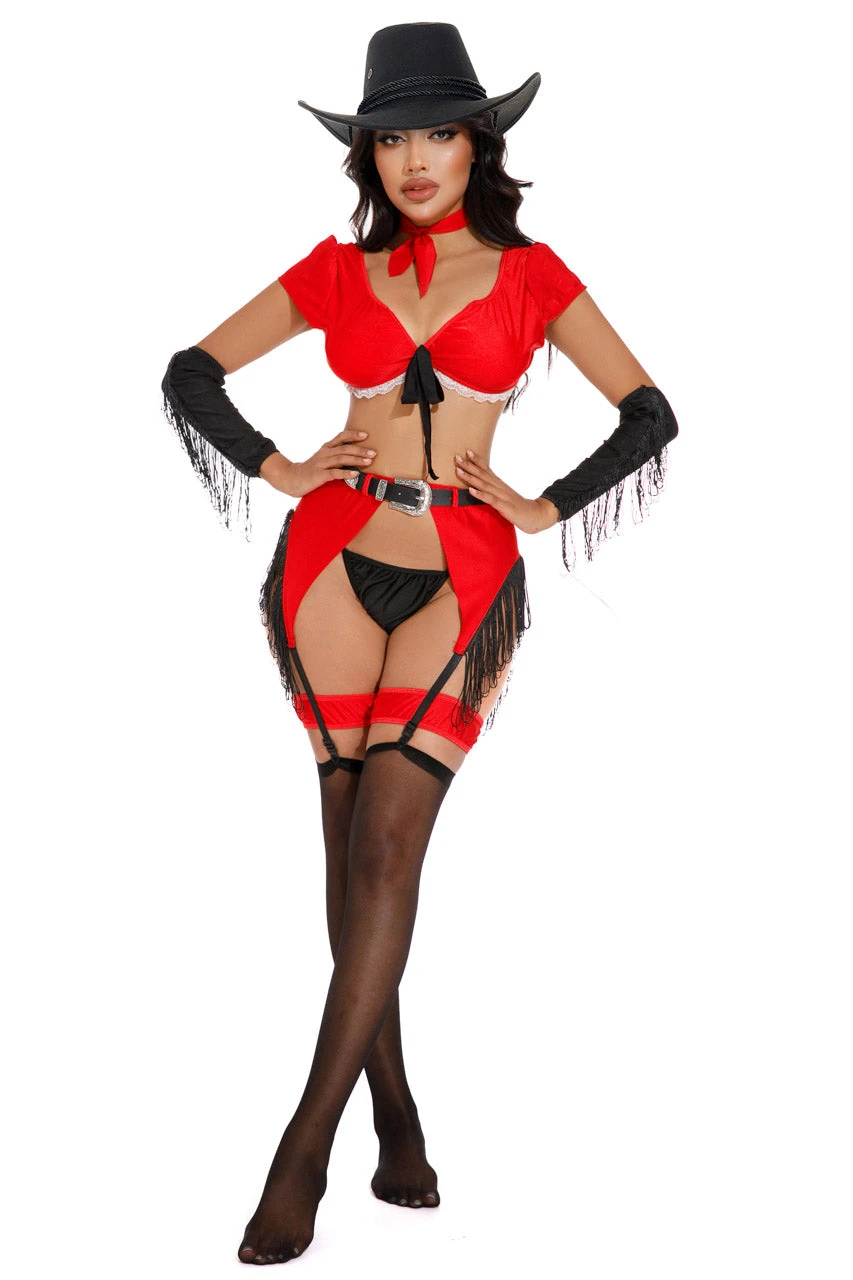 This six-piece, Bangin’ Bandit costume includes a tie front crop top with ruffled trim, a red garter belt with fringe, thong, fringe sleeves, garters, and knee high socks. (Hat sold separately.)
