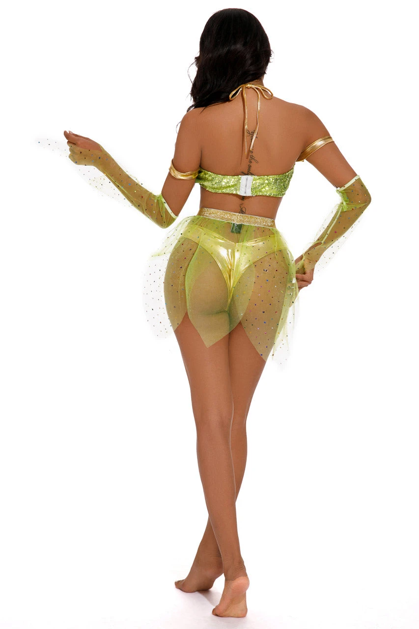 This five-piece, Fairy Fantasy costume includes a green sparkle crop top with attached arm bands, thong, mesh overskirt, sleeves, and choker. (Wings not included.)