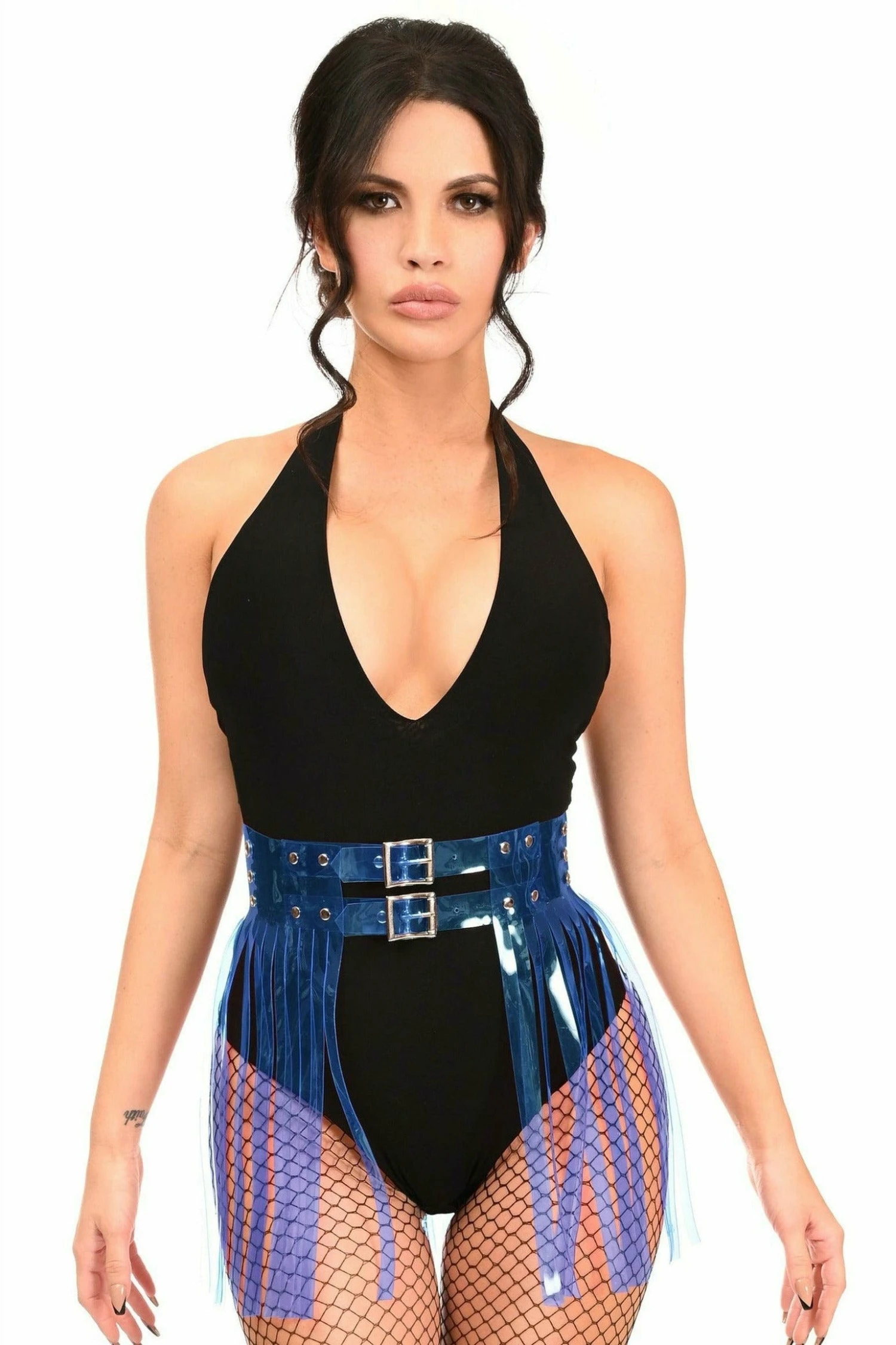 Our Blue Clear Fringe Skirt is one of a kind! This unique skirt features clear plastic fabric and silver metal hardware. The waist of this skirt is adjustable for a perfect fit.
