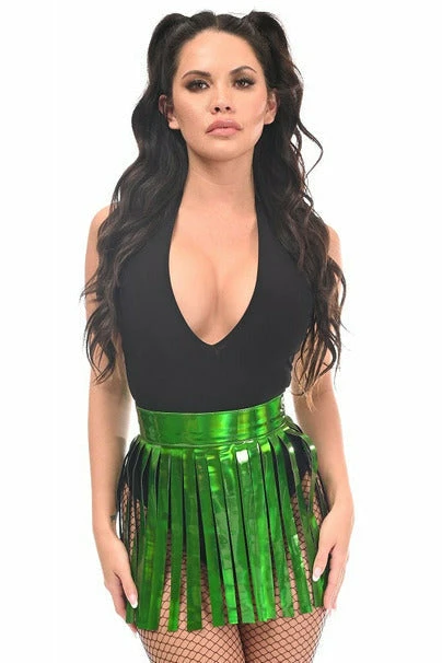 This stylish skirt has a holographic green fringe. The adjustable waistband adds comfort and ensures a perfect fit. The skirt is finished with silver hardware and a snapback closure.