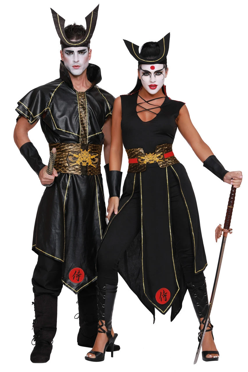 This Sexy Samurai costume features a black bodysuit with a strappy bust, matching black belt with attached panels, wrist gauntlets and matching headpiece.