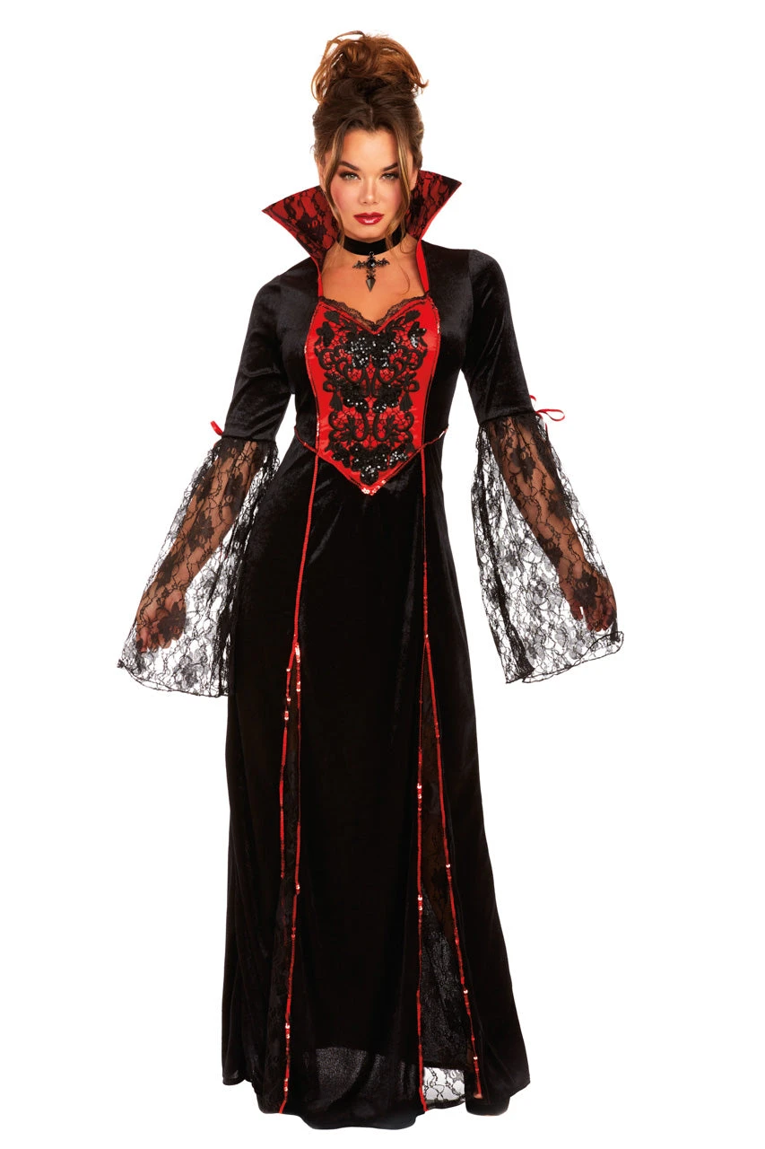 This Vampira costume includes a glamorous, long black velvet gown with lace accented stand-up collar, long lace sleeves, red sequin piping, center front beaded applique, and a gothic cross necklace.