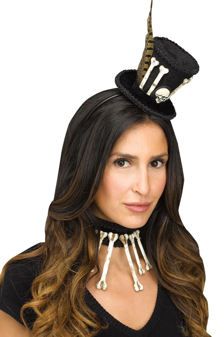 Heal those ailed by witchcraft in this Voodoo Hat & Choker Costume Accessory. Features a plush mini top hat with feathers, bones, and skull accent with matching choker. Pair this witch doctor costume accessory with a deluxe witch doctor costume or your own DIY voodoo costume!