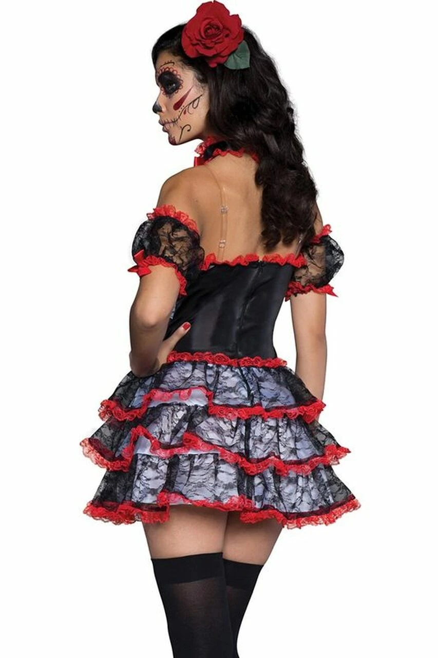 *4 Piece Day of the Dead Bone-Ita Dancer Costume for women features:*Cire Sleeveless Dress with Sweetheart Neckline