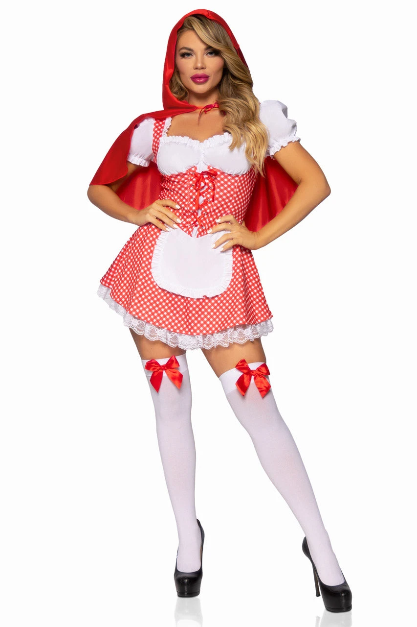 This two-piece, Fairytale Miss Red costume includes a red and white, gingham print peasant dress with an attached apron, and a matching red hooded cape. (Stockings and basket not included.)