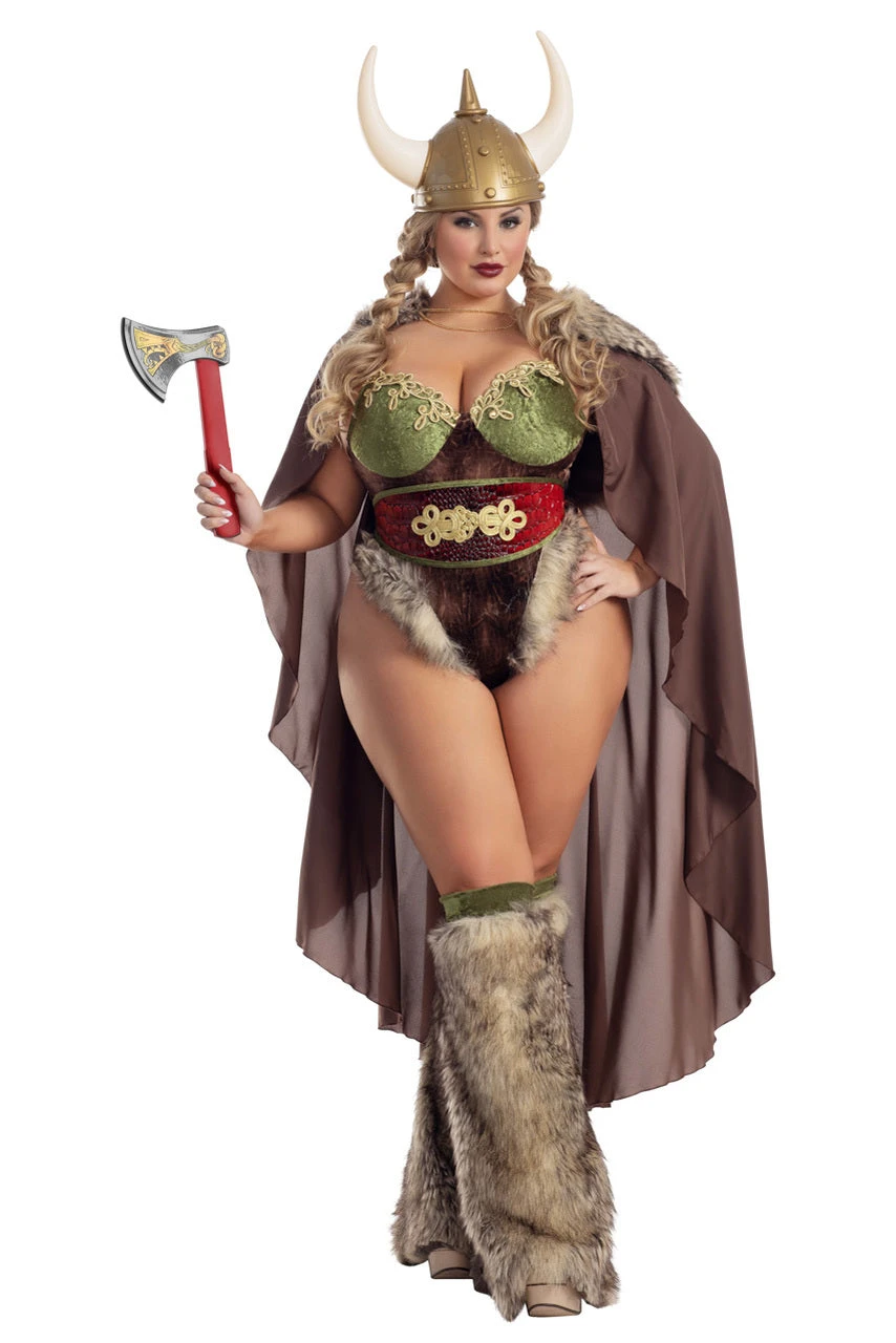 This plus size Valhalla Honey costume includes a velvet bodysuit with faux fur trim, gold appliques, belted midsection, a long brown cape with faux fur trim, boot covers and toy axe. (Headpiece not included.)