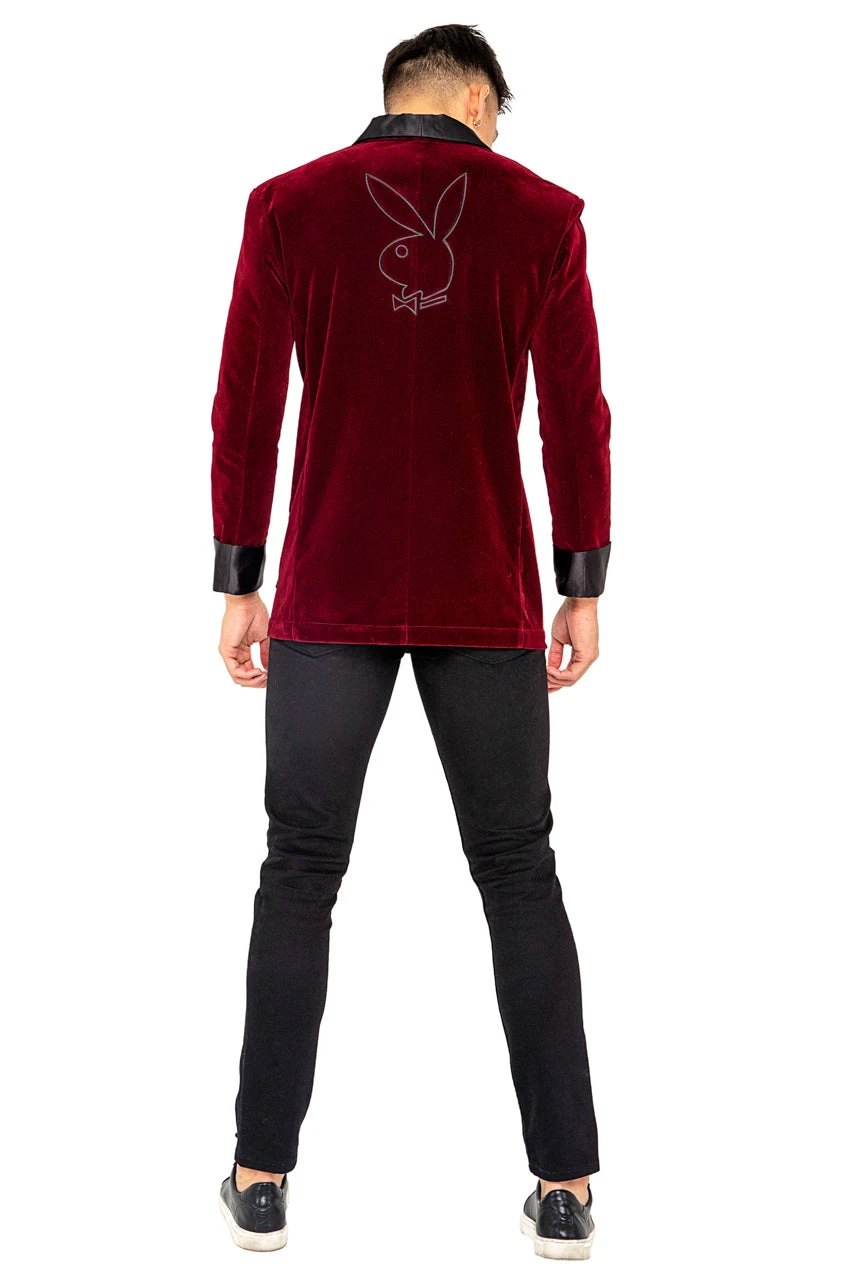 This Playboy Smoke Lounge Gent costume includes a burgundy velvet jacket with black lapels, bunny embroidery back, and shoulder pads. (Pants not included.)