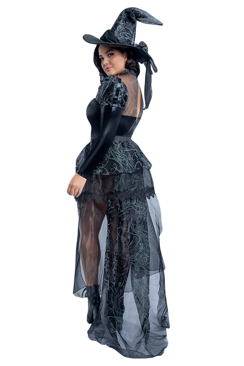 This plus size Dark Wicked Witch costume includes a black, wet look romper with green glitter swirl print organza details, a lace-up front, puff sleeves, organza tutu skirt with a high/low hemline, and a matching witch hat.
